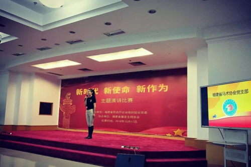 10月17日,由福建省民政厅社会组织综合党委主办的“奋进新时代,社团勇担当!”主题演讲活动成功举行,福建省马术协会党支部选派的马宇婷同志参加此次演讲,最终以9.38分的好成绩荣获第一名!